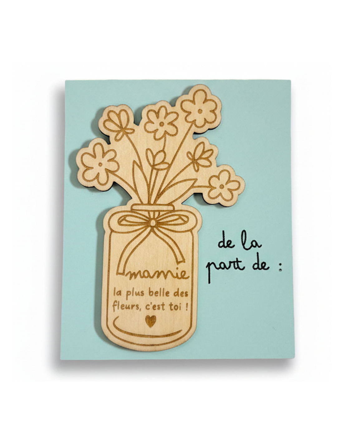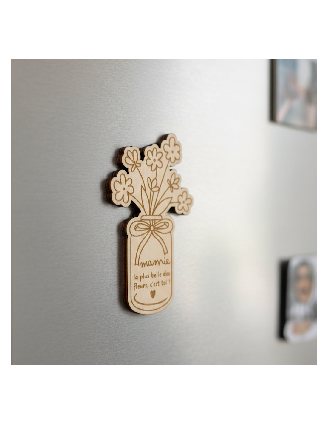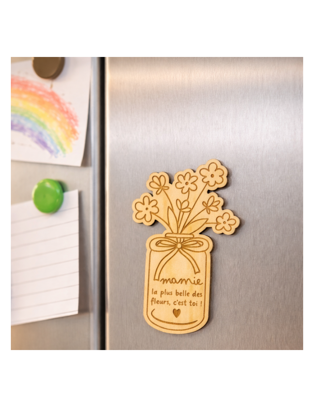 Cet aimant en bois gravé “Mamie, la plus belle des fleurs, c’est toi !” est un cadeau tendre et symbolique, parfait pour la Fête des Grands-Mères ou pour faire plaisir à sa mamie à tout moment de l’année. Présenté sur une jolie cartonnette à signer, il se transforme en souvenir précieux à garder bien en vue au quotidien.