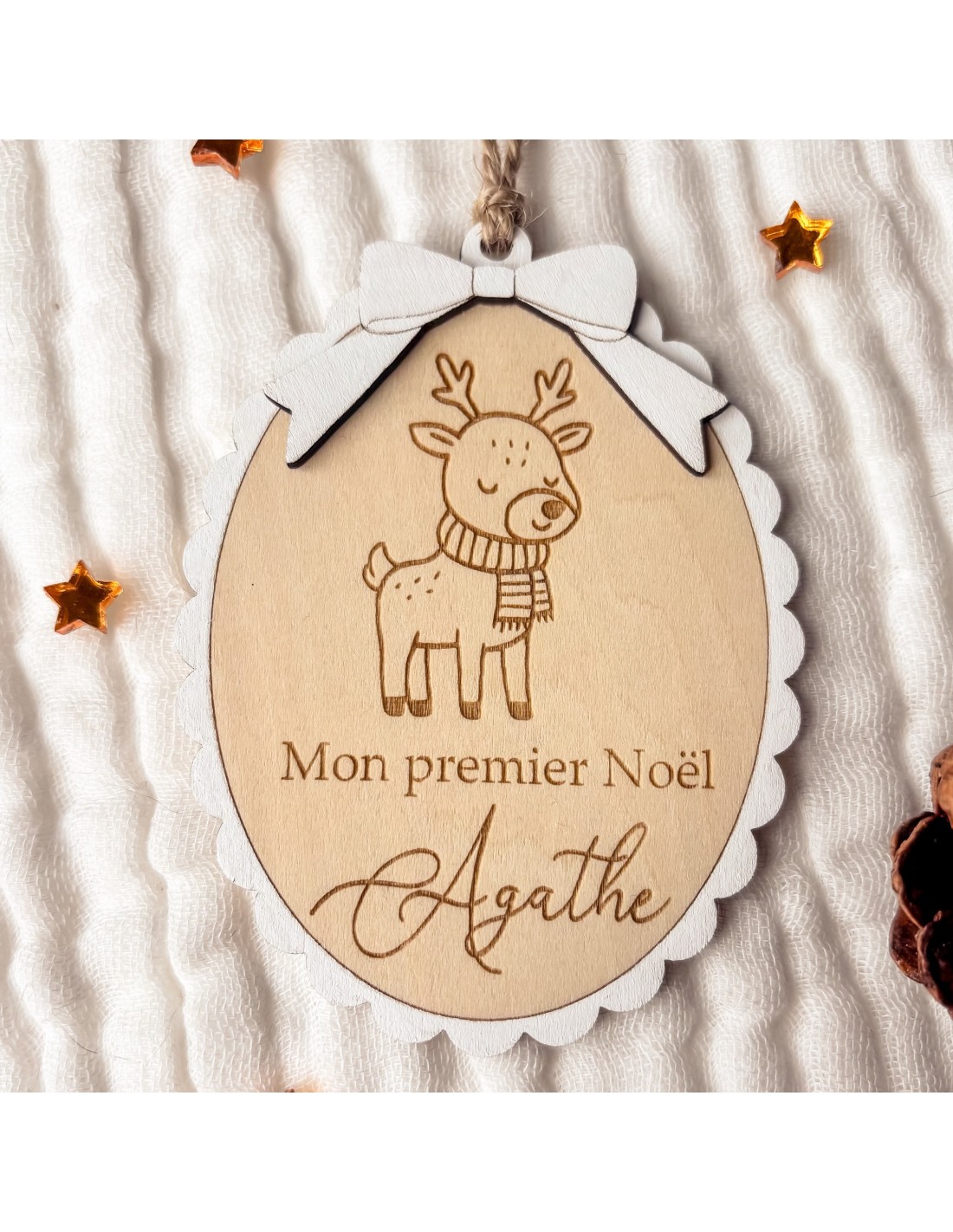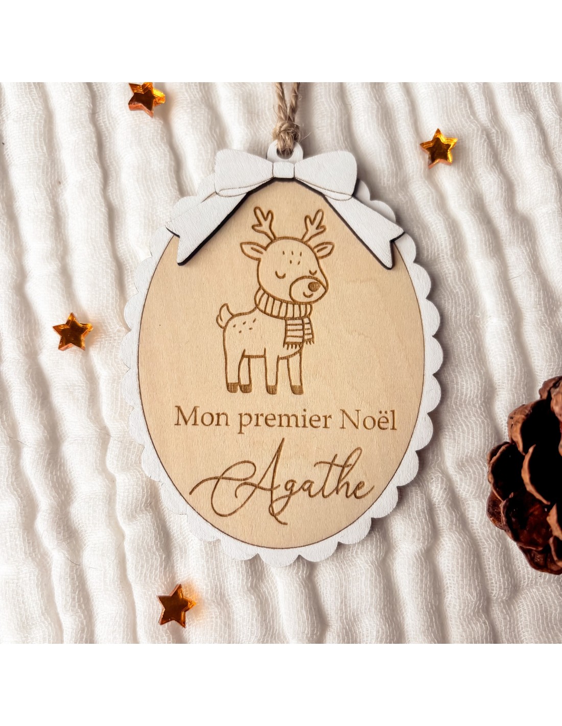 Cette jolie boule en forme de médaillon est gravée sur bois avec un petit renne et le prénom de l’enfant. Le texte peut être adapté : “Mon premier Noël”, “Joyeux Noël” ou simplement le prénom.