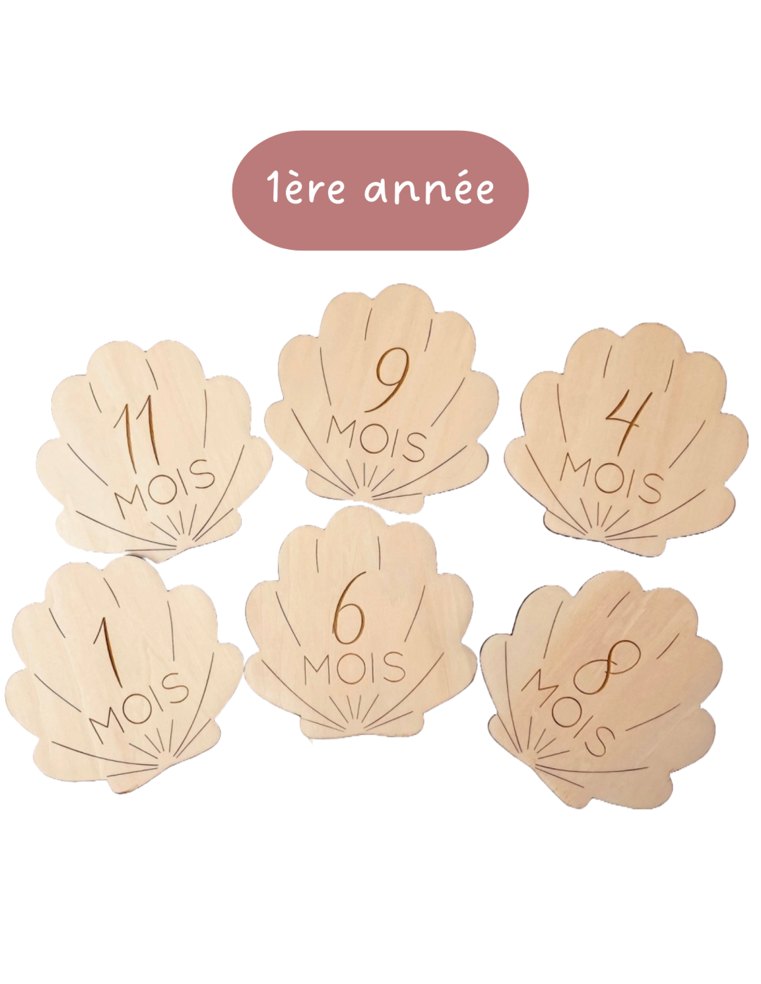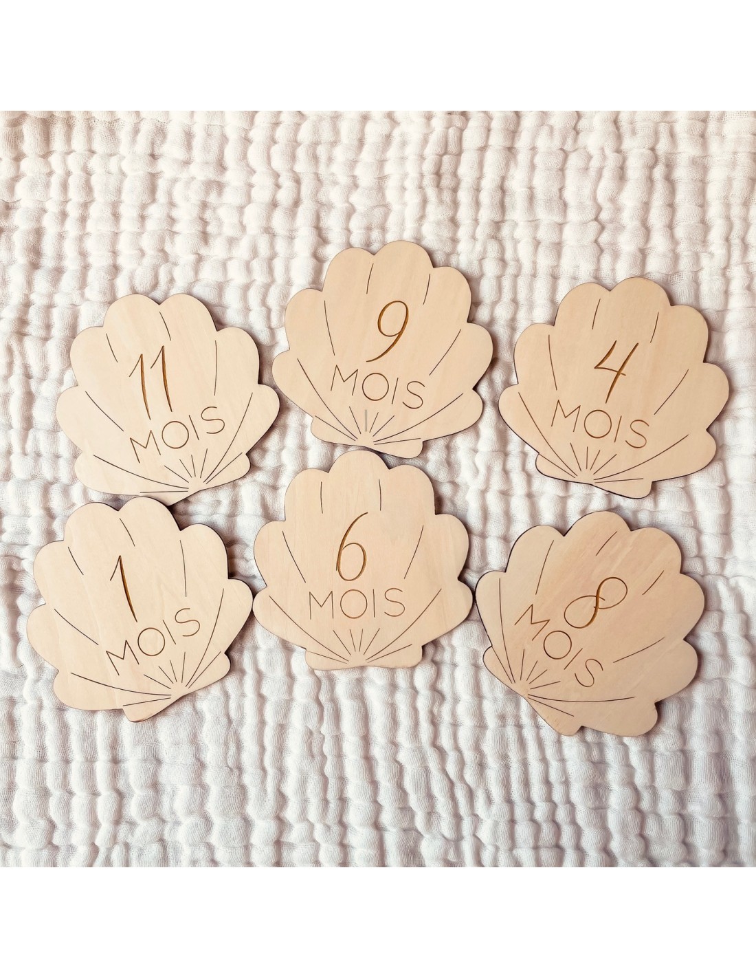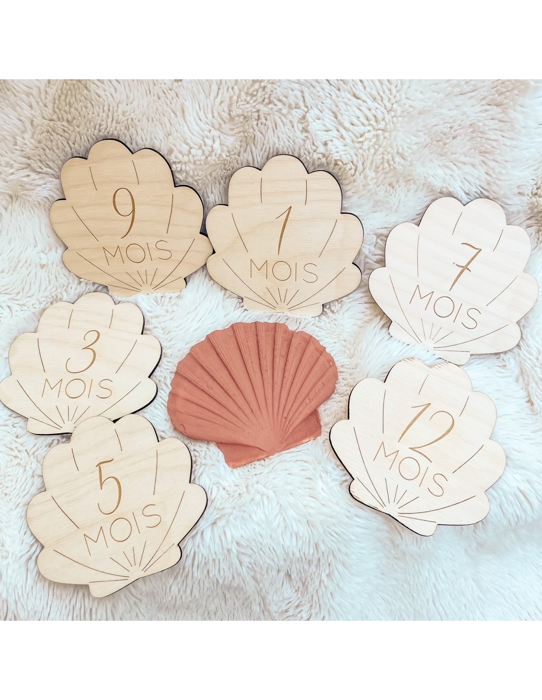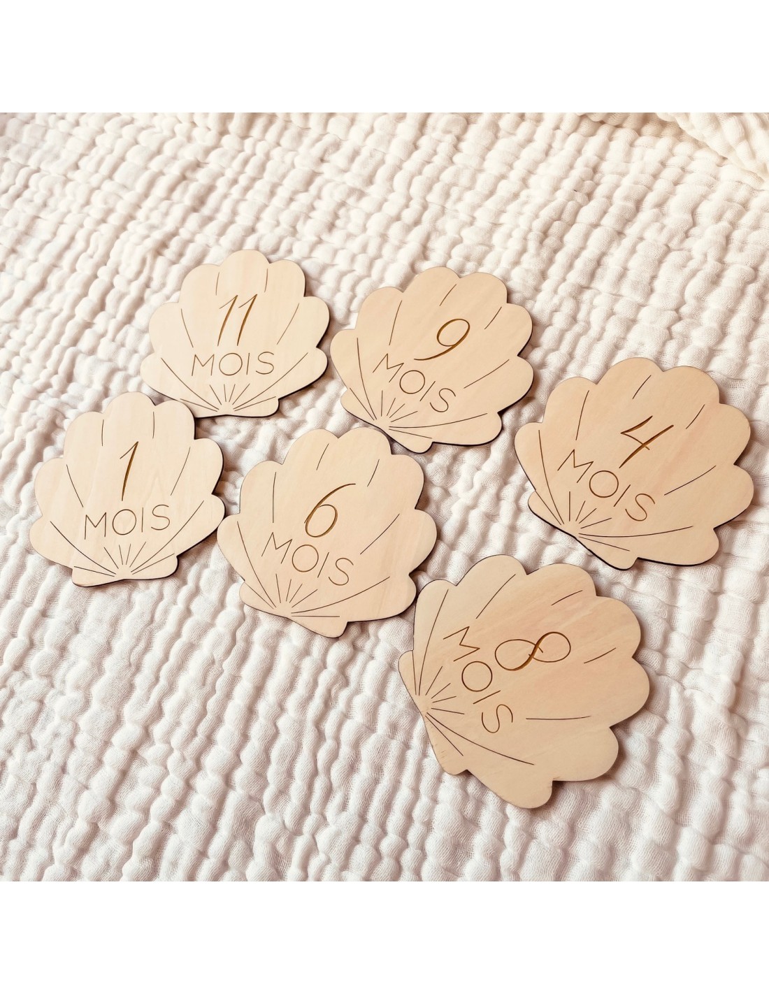 Ce lot de cartes étapes bébé en bois, au design coquillage délicat, est idéal pour créer un rituel photo mois après mois et conserver de précieux souvenirs.