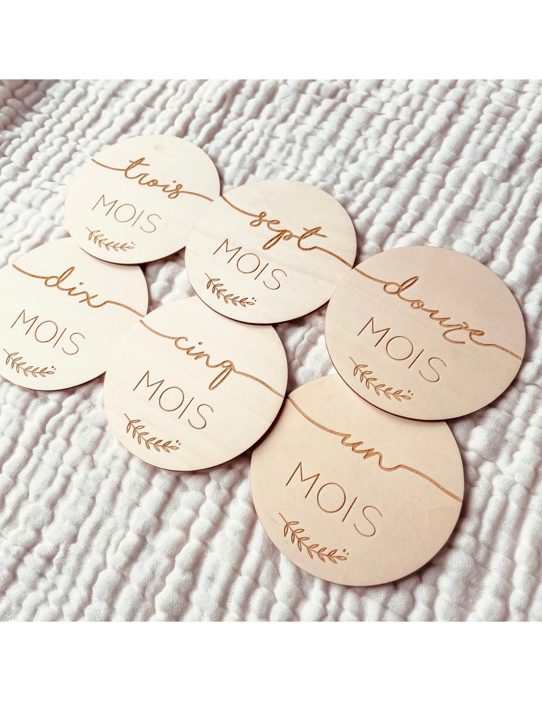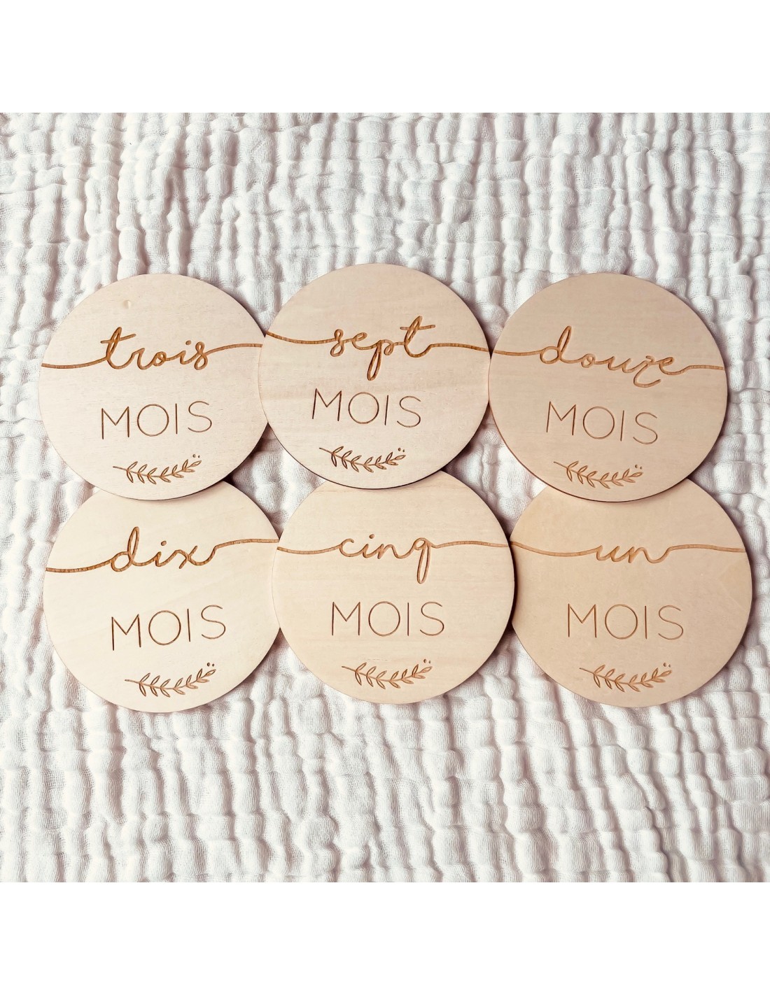 Le lot comprend 6 cartes gravées recto-verso, permettant de couvrir l’ensemble des mois de la première année tout en limitant le nombre de pièces. Ce choix permet un envoi plus léger et pratique, sans compromis sur l’esthétique.