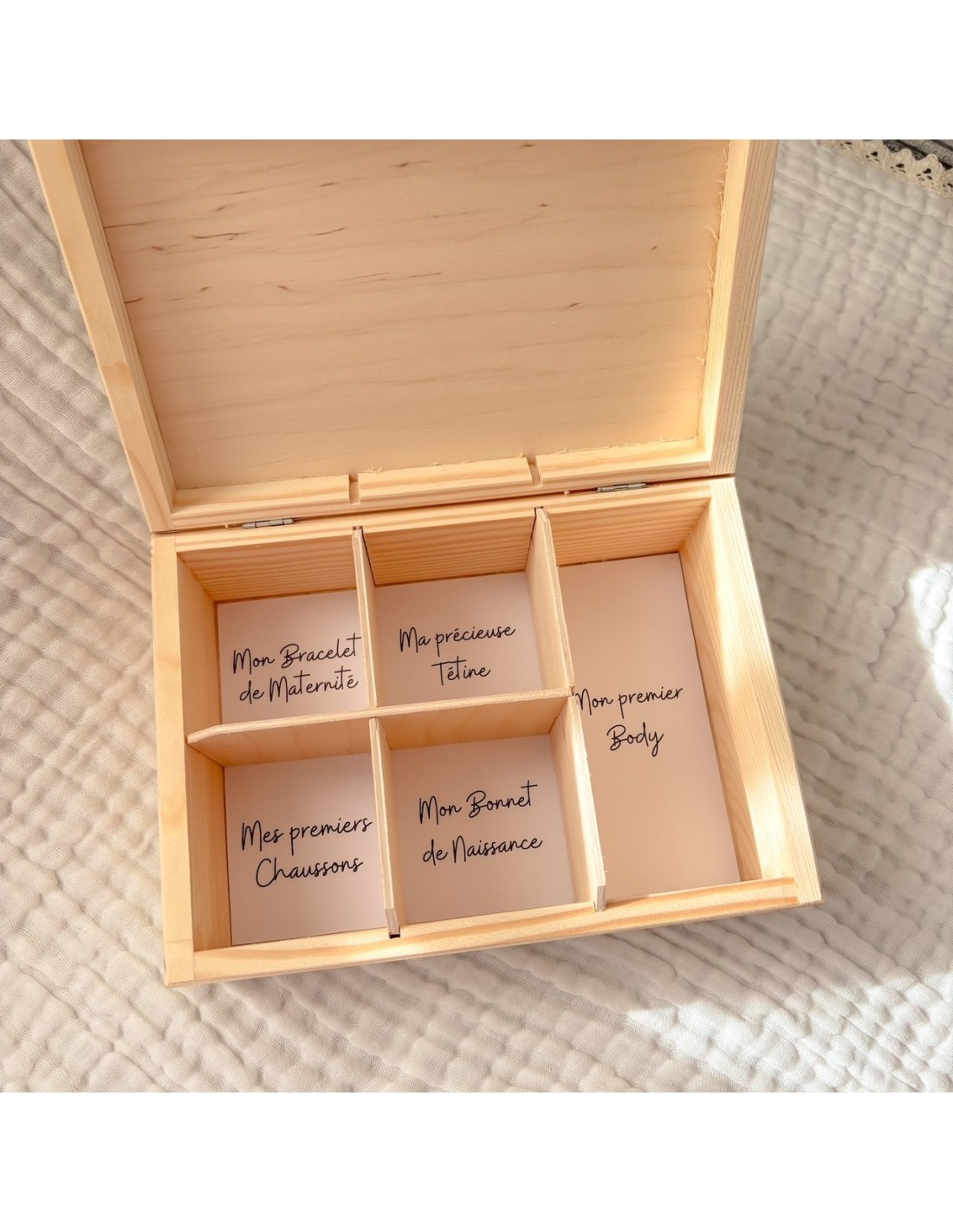 Les intitulés des compartiments peuvent être modifiés sur demande, afin de correspondre exactement aux souvenirs que vous souhaitez conserver (vêtement, doudou, photo, bijou, objet symbolique, etc.).