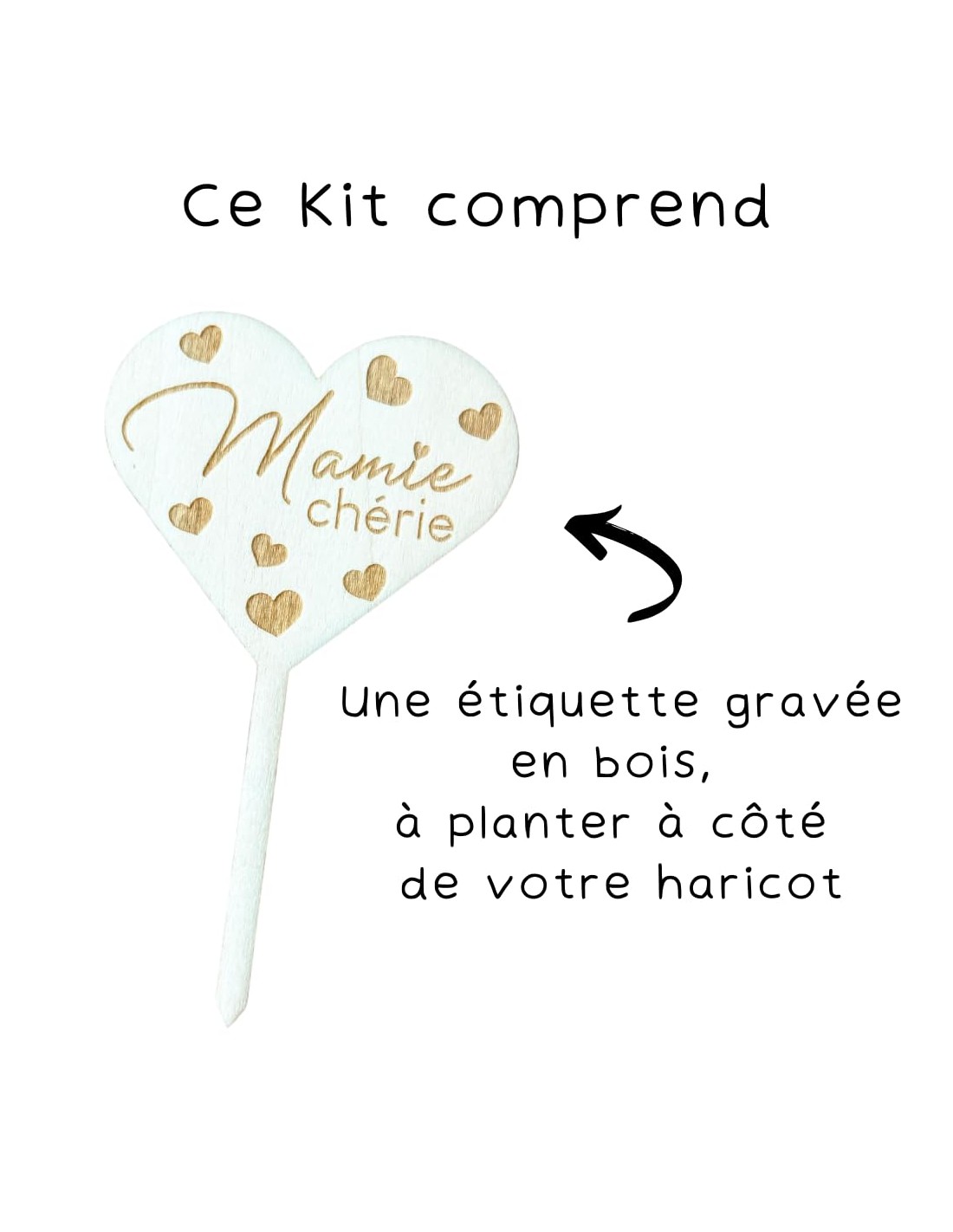 Le coffret comprend également une carte au format A6 imprimée sur papier épais, avec une jolie définition du mot Mamie, ainsi qu’une étiquette en bois en forme de cœur, gravée « Mamie chérie », à planter dans le pot une fois le haricot germé. Ces éléments complètent le cadeau et renforcent son côté symbolique.