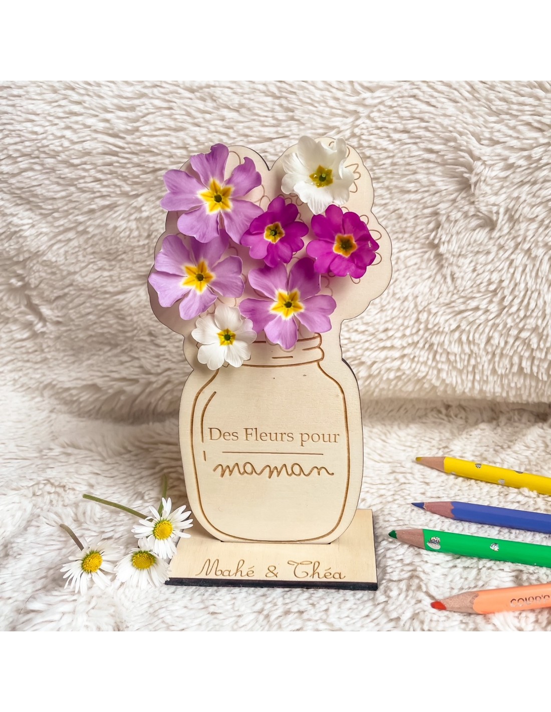 Ce support en bois (environ 15 x 10 cm) est gravé avec la mention « Des fleurs pour Maman » et conçu pour accueillir des fleurs fraîches cueillies par l'enfant. Marguerites du jardin, fleurs des champs ou pâquerettes du chemin — c'est l'enfant qui compose, et c'est ça qui compte.