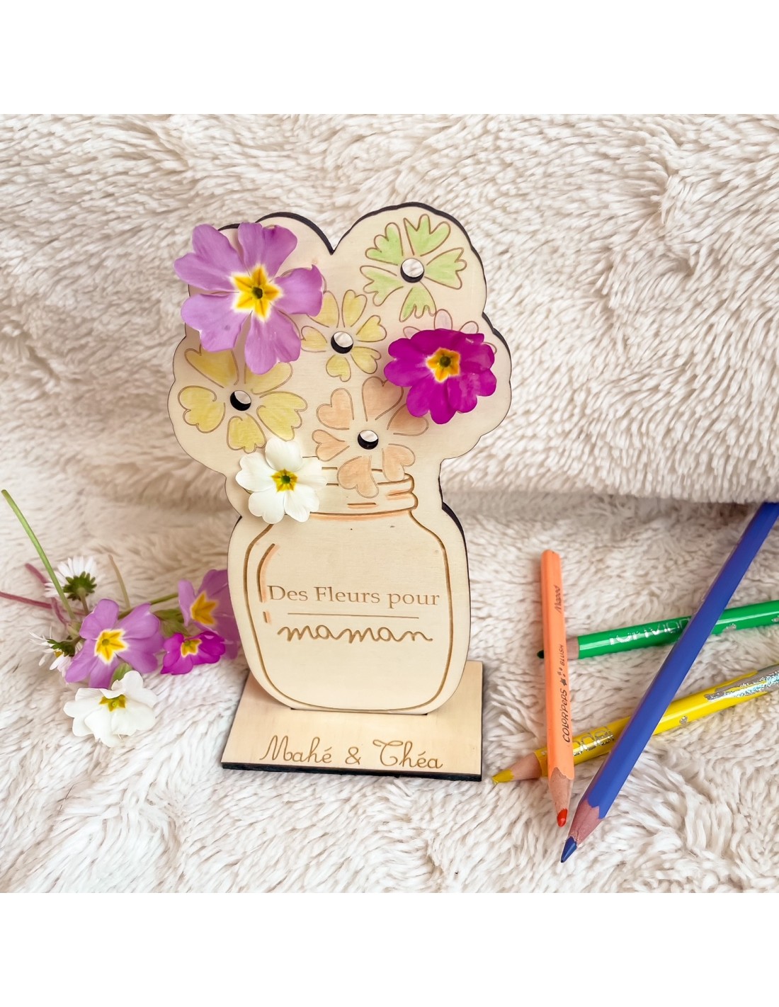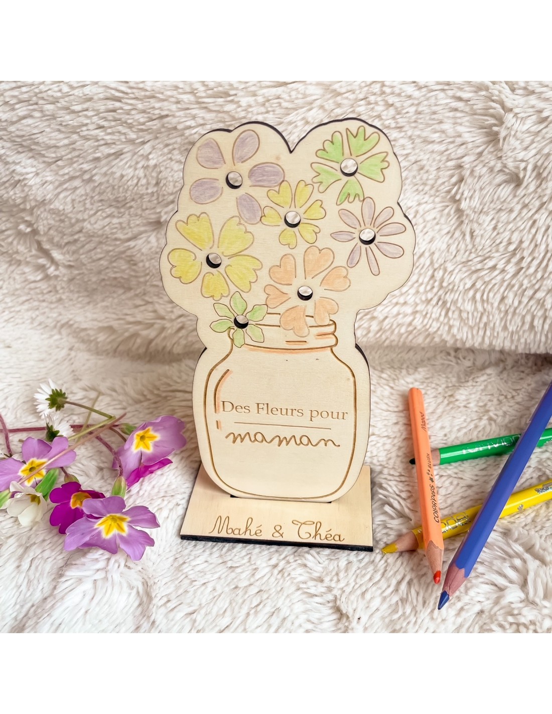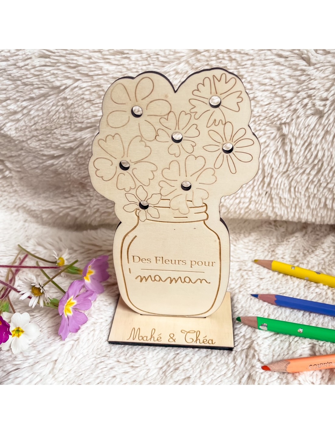 Un support bouquet en bois gravé « Des fleurs pour Maman » (environ 15 x 10 cm) : l'enfant y pique les fleurs qu'il a cueillies pour créer un bouquet unique, puis le support devient une décoration souvenir à exposer.