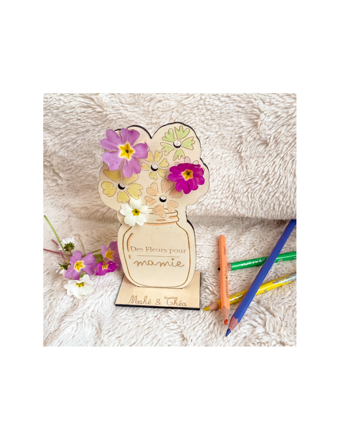 Le support peut être colorié par l’enfant avant d’y ajouter les fleurs. Une activité créative et ludique qui l’implique pleinement dans la préparation du cadeau et transforme ce moment en souvenir précieux partagé.