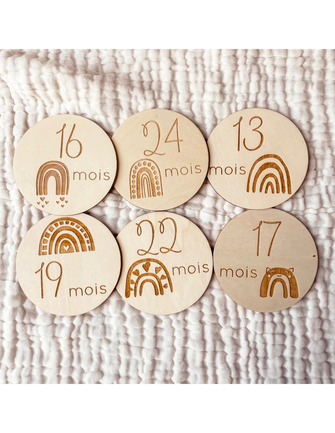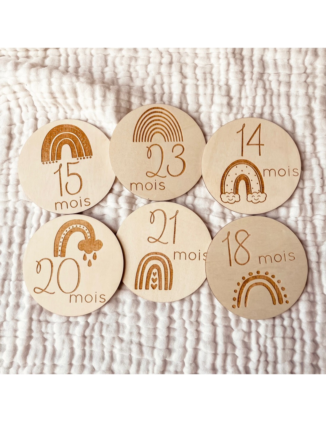 Ces cartes étapes en bois sur le thème arc-en-ciel permettent de photographier votre enfant de 13 à 24 mois, pour continuer le rituel photo durant toute la deuxième année.