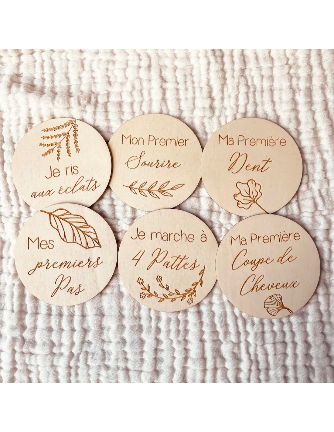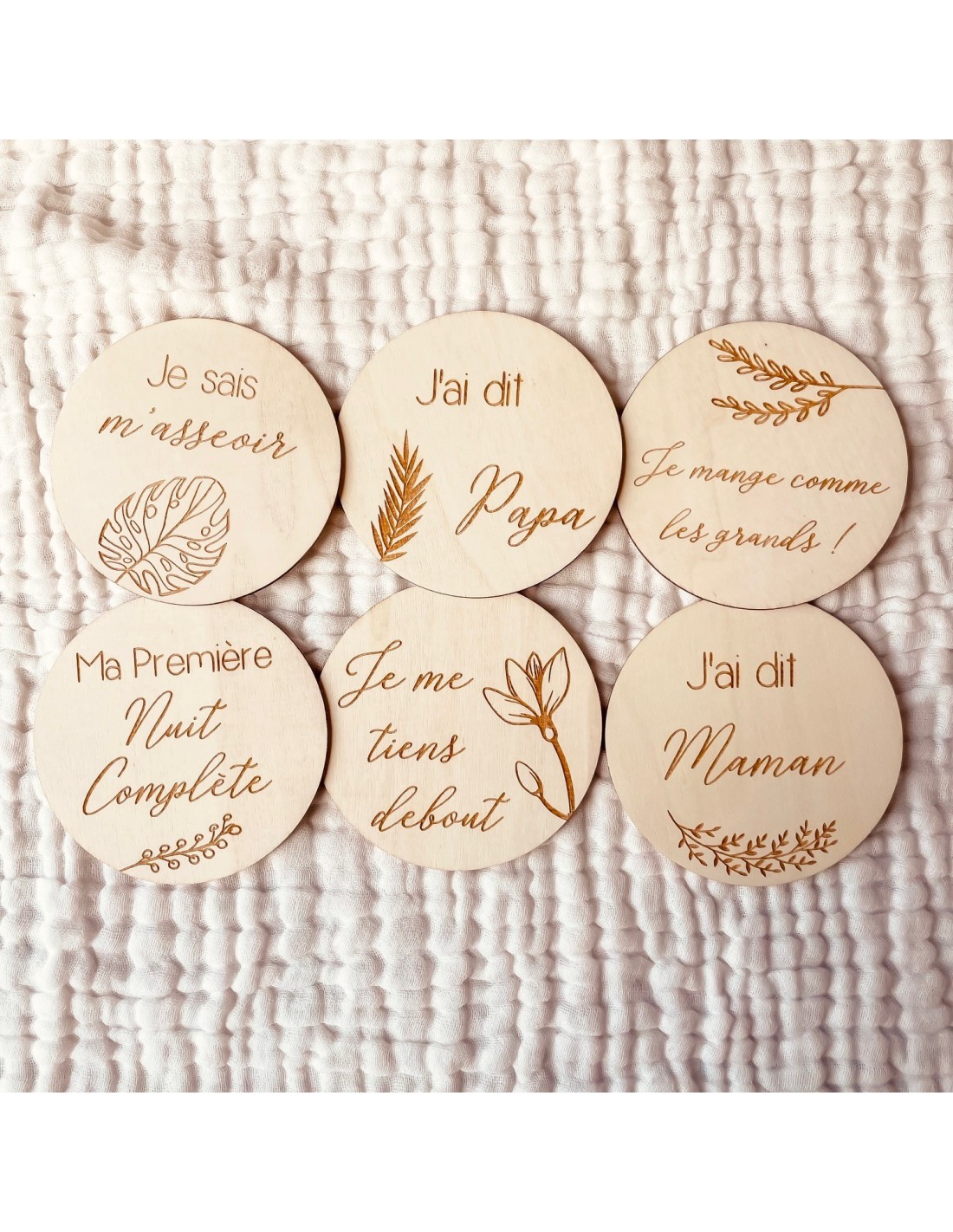 Ce lot de 6 cartes étapes en bois, gravées recto-verso, permet de capturer en photo les moments forts de la petite enfance : premiers sourires, premiers pas, premiers mots…
