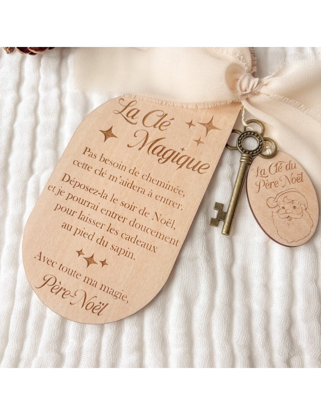 Composée d’un panneau en bois gravé, d’une clé métal vintage et d’un ruban ivoire, cette décoration associe charme, authenticité et douceur. Gravure “La Clé Magique” sur le panneau, accompagnée d’une étiquette assortie “La Clé du Père Noël”.
