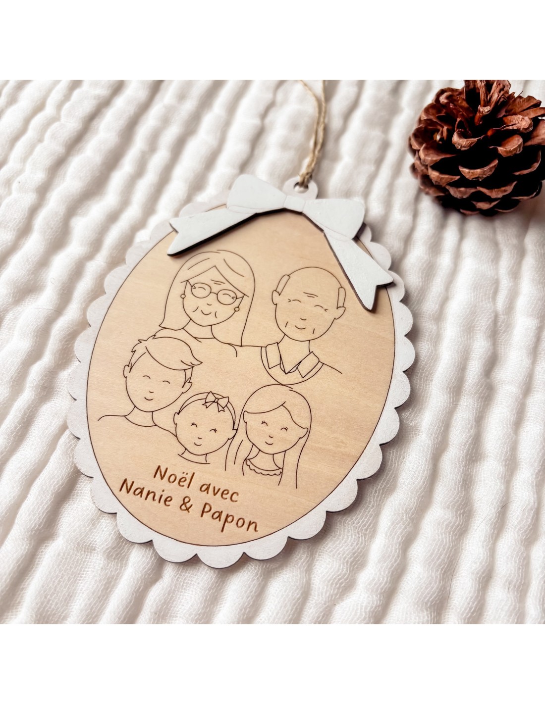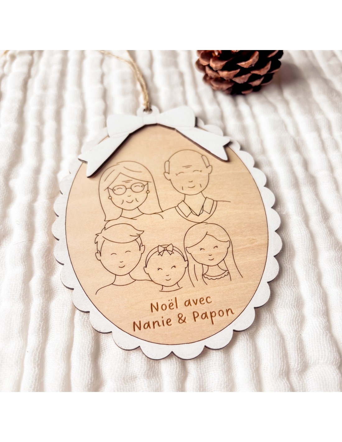 Immortalisez votre famille sur une jolie suspension en bois gravée, à accrocher au sapin ou à offrir comme souvenir.