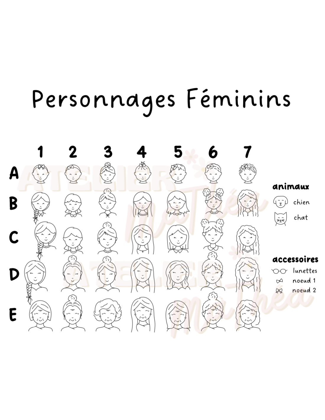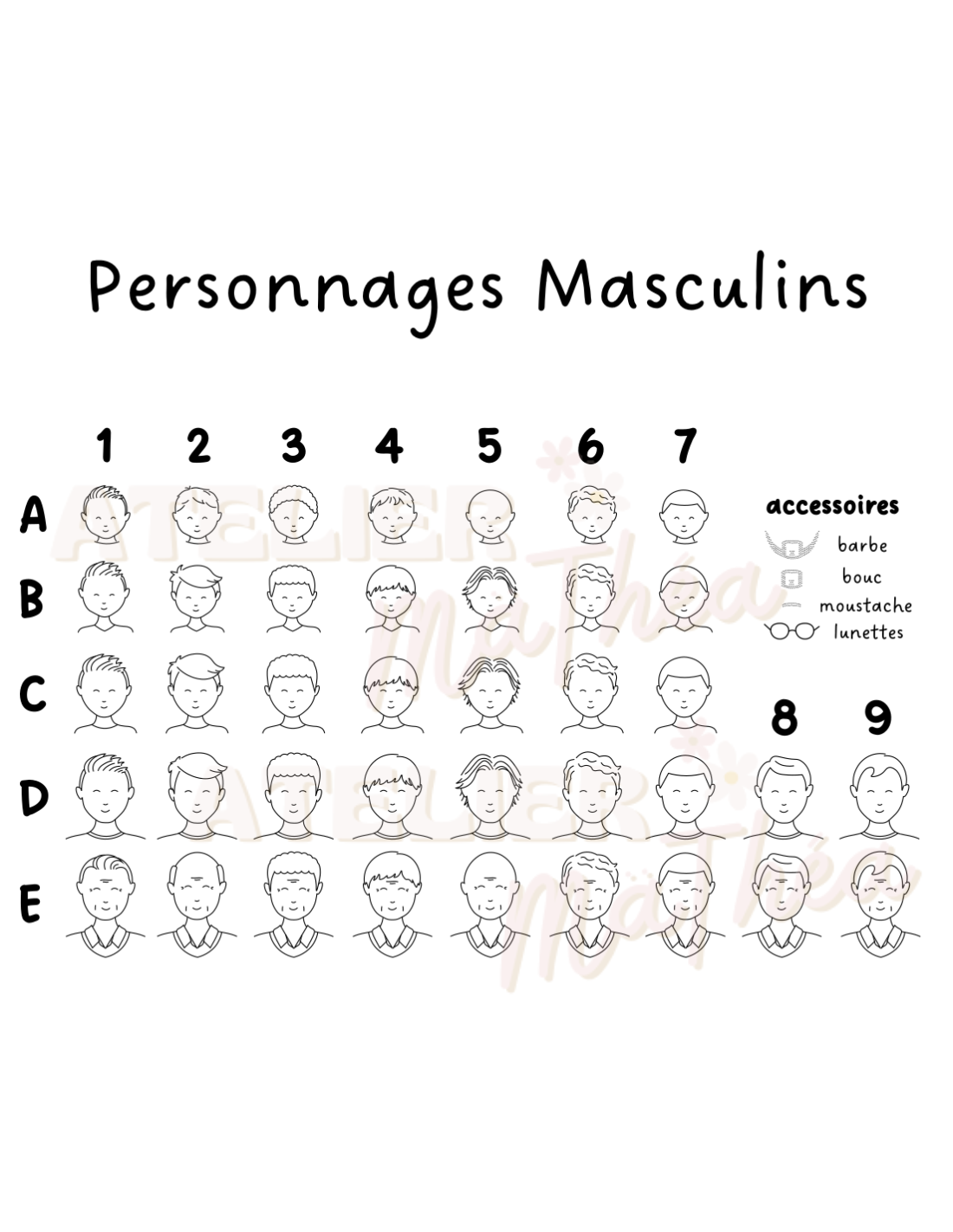 Chaque création est unique : vous choisissez les personnages (adultes, enfants, animaux) à partir des planches illustrées, ainsi que les accessoires (barbe, lunettes, nœud…).